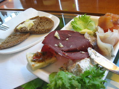 Sain mä muuten matkalla hyvääkin ruokaa. Tämä lautanen on Helsinkivantaalta; poroa, sienisalaattia, lohta, siikaa ja homejuustoa. Eikä mitään margariineja vaan oikeeta voita! Sitä muuten tarjoilee yleensä kaikki lentoyhtiötkin, mitä nyt Finski luottaa peseliin.